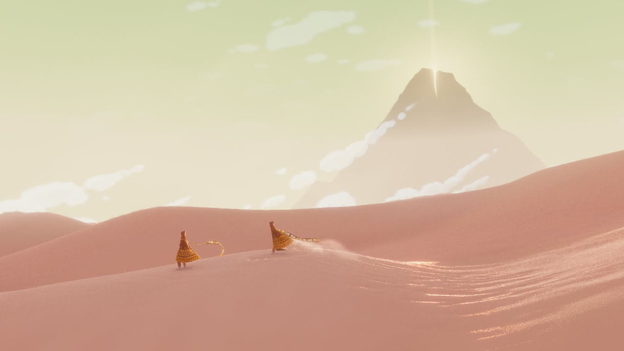 Except Journey does just that. It commands your attention from the beginning, where you climb your first sand dune and see the mountain in the distance, glowing with a slice of light awaiting you at its peak. There's a goal in the distance, and it's calling you to move towards it. And you do.